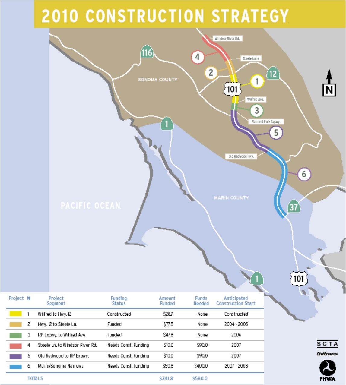 The following projects are included in the 2010 Construction Strategy for Highway 101 in Sonoma County. These projects will improve traffic operations and provide continuous High Occupancy Vehicle (HOV) lanes between southern Marin County and Windsor in Sonoma County. 1 Wilfred Avenue to Highway 12: This project has been constructed and HOV lanes are open to traffic. Final work related to electrical items, sound walls, and landscaping is under way. The environmental document for this project can be found at: www.dot.ca.gov/dist4/sonoma101/SON101.html 2a Highway 12 to Steele Lane: This project will add HOV lanes in each direction, ramp improvements and auxiliary lanes will also be provided to encourage HOV use and improve mainline traffic operations. The project also includes new structures, structure replacement and improvements, sound wall construction and relocation, and modification to the surrounding local street network to improve local circulation and access. Environmental approval is anticipated in 2003, and construction is anticipated to begin in 2005. For more information on this project, visit: www.dot.ca.gov/dist4/route12wpg.htm. 2b Steele Lane Interchange Improvements: This project was originally combined with the Highway 12 to Steele Lane Project, but now has a separate schedule. The project will reconstruct the interchange and add HOV lanes. Environmental approval is anticipated in 2003, and construction is anticipated to begin in 2004. 3 Rohnert Park Expressway to Wilfred Avenue: This project will add HOV lanes in each direction, add auxiliary lanes between the Rohnert Park Expressway and Wilfred Avenue Interchanges, provide ramp improvements, construct one new and modify an existing park-and-ride lot, and modify the local street network to improve access and circulation. The environmental approval is anticipated in 2005, and construction is anticipated to begin in 2006. This project is fully funded, however, construction may be delayed if state budget cuts cause funding to be held back. 4 Steele Lane to Windsor River Road: This project will add HOV lanes in each direction, ramp improvements and auxiliary lanes will also be provided to encourage HOV use and improve mainline traffic operations. Environmental assessment begins in 2003, environmental approval is anticipated in 2005, and construction is anticipated to begin in 2007. This project is funded through the environmental and design phases. GARVEE bonds are anticipated to fund the construction phase. 5 Old Redwood Highway in Petaluma to Rohnert Park Expressway: This project will add HOV lanes in each direction, ramp improvements, auxiliary lanes between SR116-Gravenstein Highway and Rohnert Park Expressway if studies show they are needed, and a northbound climbing lane along Cotati Grade. Interchange improvements at Railroad Avenue are an option. Environmental assessment begins in 2003, environmental approval is anticipated in 2005, and construction is anticipated to begin in 2007. This project is funded through the environmental and design phases. GARVEE bonds are anticipated to fund the construction phase. 6 Marin/Sonoma Narrows: This project will add HOV lanes from Highway 37 in Novato to Old Redwood Highway in Petaluma, upgrade the "Novato Narrows" section to freeway, provide interchanges and frontage roads to replace at grade intersections and driveways, and make ramp improvements. The project will be constructed in phases. Initial construction phases would provide HOV lanes and ramp improvements between Highway 37 and Atherton Avenue in Novato, and between Highway 116 (East) - Lakeville Highway and Old Redwood Highway in Petaluma. This project is funded for environmental, engineering design and right-of-way work. An additional $400 million in construction funding is still needed. Environmental approval is anticipated in 2005-2006, and construction is anticipated to begin in 2007- 2008. Given state funding issues, project delivery dates for this project may change. For more information on thisproject visit: www.dot.ca.gov/dist4/msn. |