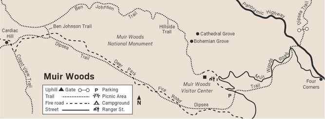 Most visitors to Muir Woods take the level main trail, following Redwood Creek. For a less crowded hike try a 4.5-mile loop on the Deer Park, Dipsea, Ben Johnson and Hillside trails. Now that we’ve had some rain, winter delights like mushrooms, ferns and salamanders abound, and the moss is so green you could be in Oz’s Emerald City. If you are doing the hike now, the plank bridge has been removed to facilitate passage of the salmon during their spawning season so you can’t start out on the Dipsea Trail. Walk south on the shoulder of the Muir Woods Road to Deer Park Fire Road. Head uphill until it joins the famed Dipsea Trail. There is no sign, but you will notice a trail joining the fire road and running parallel. Started in 1905, the Dipsea is the oldest trail race in the US. Each year 1,500 runners participate, and more than 200 have now upped the ante and do a quad Dipsea, running the 7.4-mile course four times. I am happy to amble up this trail soaking in ambiance. Deer Park Fire Road and the Dipsea Trail cross and re-cross each other and in this section so it really doesn’t matter which one you take. I prefer the trail since cyclists use the fire road. To the west, the sun on the ocean made me think of the lyrics “from sea to shining sea” and remember how as a child growing up in Manhattan I longed to see the “purple mountains majesty” and that second shining sea. There is a sunny stretch with coyote brush and the non-native cotoneaster. When I did this hike, robins were enjoying the red cotoneaster berries. Soon you are in the woods, still going uphill. Now the rains have begun working their magic, the first California polypody ferns have appeared. California slender salamanders, sometimes called worm salamanders because of their tiny legs, have come up from the earthworm burrows where they retreated for the summer. These lungless salamanders breath through their skins, which must be kept moist. Banana slugs also like the rain though they have slime to help keep them moist. (It’s useful to know that if you touch one, washing your hands makes you slimier as the slime is designed to absorb water. Just rub your fingers as you would if you had white glue on them and the slime rubs right off.) Banana slugs have a single lung, and an opening called a pneumostoma on the right side of the mantle, behind the head. Take a moment to watch until the slug takes a breath and you’ll see the hole open. Banana slugs were nominated as our state mollusk, but sadly the legislature did not see fit to adopt them so they will have to be content with being the mascot of the University of California at Santa Cruz. At the junction with the Ben Johnson Trail there is a lot of trail work equipment. If it’s near lunch time, I like to make a detour here and head up Deer Park Fire Road to Cardiac Hill. From this sunny vista point you can see the Farallones, part of San Francisco, Tiburon and Belvedere, the Bay Bridge and Mount Diablo. Western bluebirds often like to perch on the utility lines here, the males sporting brilliant blue feathers while the females have more subtle coloring. Retrace your steps if you took the detour, and take the Ben Johnson Trail. Because of the trail work there are some well-marked but muddy, slippery detours at the start. While I understand the necessity of fences on the main trail, to me the experience of walking through redwoods on an unfenced trail is different. With appreciation for the opportunity to experience the woods this way, I am happy to stay on the trail. There are several dramatically hollowed out trees in the section. As you cross a plank boardwalk over the area notice three ferns; chain fern, lady fern and the less-common five-fingered fern, all growing in one spot. Turn right on Hillside Trail for one mile to return to complete the loop. No dogs. To get to Muir Woods Take the Mill Valley/Highway 1/ Stinson Beach exit. Follow the signs to Highway 1 (Shoreline Highway), then go north on Panoramic Highway. At Four Corners take Muir Woods Road to Muir Woods. Park in the overflow parking lot. No fee. Wendy Dreskin has led the College of Marin nature/hiking class Meandering in Marin since 1998, and teaches other nature classes for adults and children. To contact her, go to wendydreskin.com. | ||||||