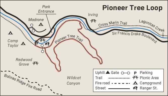 A three-mile loop through redwoods in Samuel P. Taylor State Park would be rated easy if it weren’t for all the downed trees. There are places you have to go around, over or under downed trees, and one spot where the root ball has taken much of the trail, making the remaining trail narrow. Part of the loop is on the Cross Marin Trail, which is paved and easy. The park is named for Samuel Penfield Taylor, who in 1852 bought 100 acres of land from Don Rafael Garcia, the original land grantee, with $505 from panning gold in Tuolomne County. This was before the railroad, or even wagon road over White Hill, and the land could only be reached on horseback. At that time, all paper had to be brought to California by ship, coming around the Horn or from China. Although the creek is not running now, there are still many species of ferns, including water-loving lady ferns, delicate five-finger ferns and the classic understory fern of the redwood forests, Western sword fern. Since his family owned a papermill in the Catskills in New York, Taylor decided to go into the paper business. He set Chinese laborers to work building a trail over Bolinas Ridge that could take the paper by schooner from Bolinas to San Francisco, and went back east to purchase a mill and hire men to install it. The mill produced the first paper on the West Coast in November 1856. At that time paper was made from rags, and manila was made from old rope, but many trees were cut down for other purposes. The old-growth redwoods were felled to build the mill, the dam for the mill pond and the Taylors’ house in the Devil’s Gulch area of the park. Tan oaks were harvested and their tannins used for another business, the tannery which the Taylors also operated on the property. From the picnic area cross the bridge over Lagunitas Creek (called by its old name Papermill Creek on some maps) and turn left on the Cross Marin Trail. This is the bed of the old narrow-gauge railroad, which began carrying freight in 1874 and passengers in 1875. Much of the line was abandoned when the Woodacre tunnel collapsed in the 1906 quake, but some sections continued to be used until 1938. Turn right on the signed Pioneer Tree Trail. Lush elk clover with its huge leaves — which is in fact not a clover but California’s only plant in the ginseng family — has black berries now. Native Americans used the roots for a variety of medicinal purposes. Although the creek is not running now, there are still many species of ferns, including water-loving lady ferns, delicate five-finger ferns and the classic understory fern of the redwood forests, Western sword fern. Look for a single pawnbroker bush on your left, named for its cluster of three red berries reminiscent of the three golden balls that identify a pawnbroker’s shop. Some of the redwoods are scarred by the 1945 fire. As the trees grow in girth, the blackened areas of bark become separated by new bark, creating brown and black stripes. A few of the trees have “cat’s eyes.” These hollowed out areas at the base of redwoods are often on the uphill side because over many years debris piles up against the trunk. When a fire sweeps through, this pile of branches and needles burns at a high temperature, hollowing out the tree. The Pioneer Tree is just off the trail, and marked with a sign. It was probably spared by the loggers because it is hollow. I like to go inside this 500-year-old tree. Once I was lucky enough to see some bats using it as a day roost. Past the Pioneer Tree the redwoods thin out and you’ll see more bays, bigleaf maples, and Douglas firs. Notice how the bays grow at an angle if they need to in order to reach sunlight. On hot days, you feel the temperature difference as you leave the redwoods. Turn left on the Cross Marin Trail, and follow it back to the picnic area. Samuel P Taylor State Park is 15 miles west of San Rafael. Take Sir Francis Drake Boulevard and turn at the entrance signed Camp Taylor. Dogs are allowed on Cross Marin Trail but not on Pioneer Tree loop. Entrance fee is $8, $7 for seniors. Wendy Dreskin has led the College of Marin nature/hiking class Meandering in Marin since 1998, and teaches other nature classes for adults and children. To contact her, go to wendydreskin.com. | ||||||