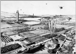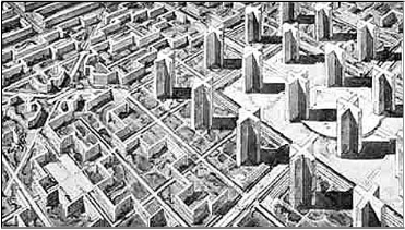 The Radiant City envisioned thousands of boxy, well lit, unadorned living units stacked in towering glass, concrete and steel skyscrapers built in close proximity to transportation (automotive super highways) and within walking distance to shopping and other necessities (“The more things change…”).
