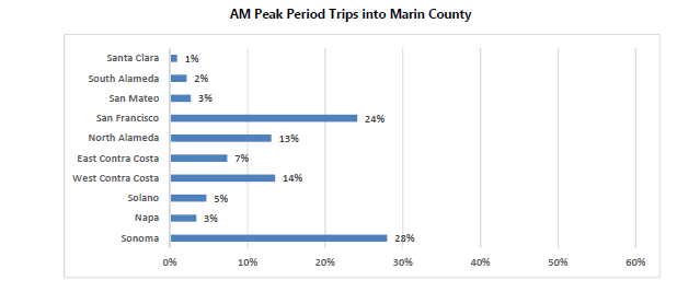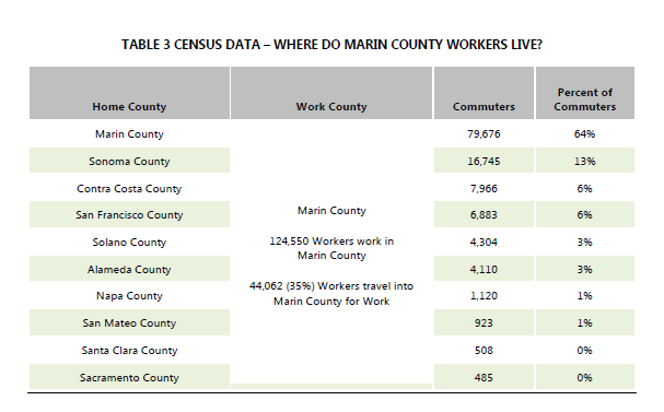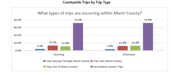 Out of the 124,550 workers in Marin, only 44,062 (35%) travel into Marin for work. * Note that not included in the INTRAs are parents dropping off their kids at school ( if they don't stop for more than 5 minutes doing it). "Origin-destination trip table data analysis may miss school drop-off trips as the algorithms determine a trip to end only when the mobile device has moved less than five meters in five minutes." Average Weekday Ridership Across Golden Gate Bridge , by Golden Gate Buses, is 7,507 ( 2017). That's 3,754 roundtrips. source |
